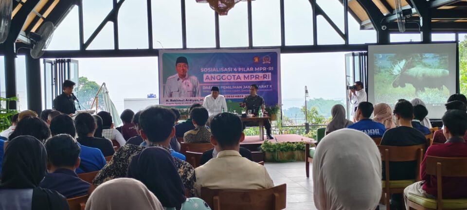 Seputarkuningan.com – Anggota MPR RI Fraksi Gerindra Dapil Jabar x, H. Rokhmat Ardiyan, menggelar sosialisasi 4 Pilar Kebangsaan bersama puluhan organisasi mahasiswa (ormawa) di Kabupaten Kuningan. Sekitar 120 peserta hadir dalam kegiatan ini, yang tidak hanya berisi pemaparan materi, tetapi juga dialog dan tukar gagasan tentang peran generasi muda di era digital, Rabu (17/12/2025).