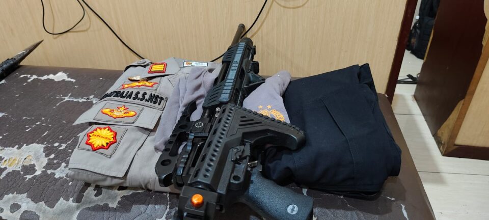 Dalam penangkapan tersebut, polisi mengamankan barang bukti berupa satu setel seragam PDL Polri pangkat AKP atas nama MATRAJA S.S.NST, satu buah senapan angin model menyerupai AK47, dua buah soft gun, satu buah pistol mainan dan berbagai dokumen palsu.