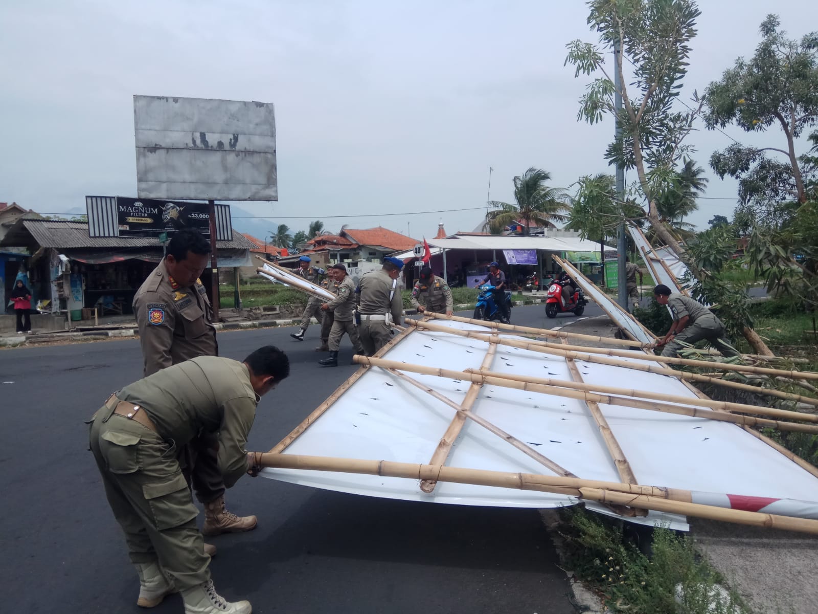 Seputarkuningan.com – Petugas gabungan dari Bawaslu, Satpol PP, dan Dishub di Kabupaten Kuningan, Jawa Barat, menertibkan kembali baliho caleg maupun capres hingga bendera partai politik yang terpasang di sepanjang jalan protocol yang dianggap melanggar.