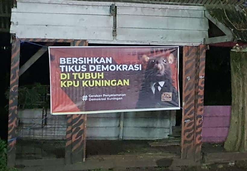 Spanduk tersebut terpasang di beberapa titik dibeberapa kecamatan yang ada di kabupaten Kuningan, dengan kata yang dibangun “Bersihkan Tikus Demokrasi Ditubuh KPU Kuningan”, yang dimana spanduk tersebut berhastag Gerakan Penyelamatan Demokrasi Kuningan.