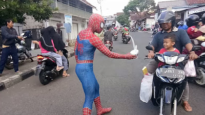 Tidak hanya itu, dua sosok pemuda dengan seragam spiderman itu menjadi incaran para anak – anak yang tengah dalam kendaraan lalulalang tadi. Sehingga tidak sedikit tokoh film hewan laba-laba ini menjadi spot foto selfie.